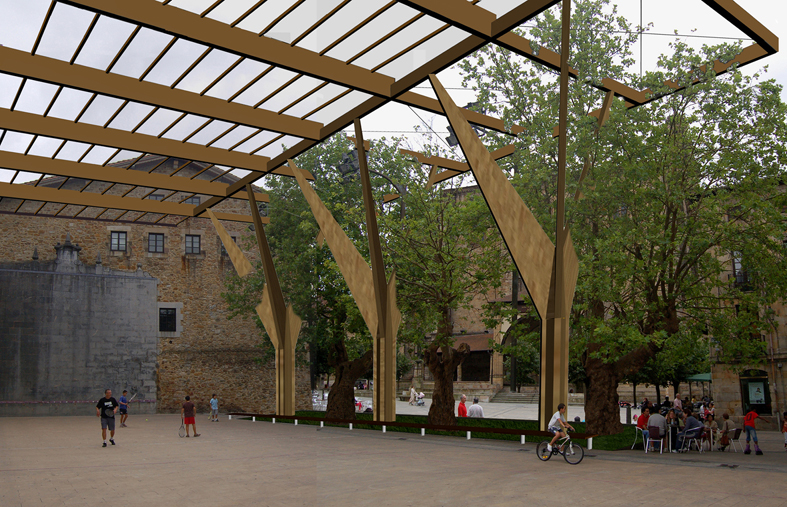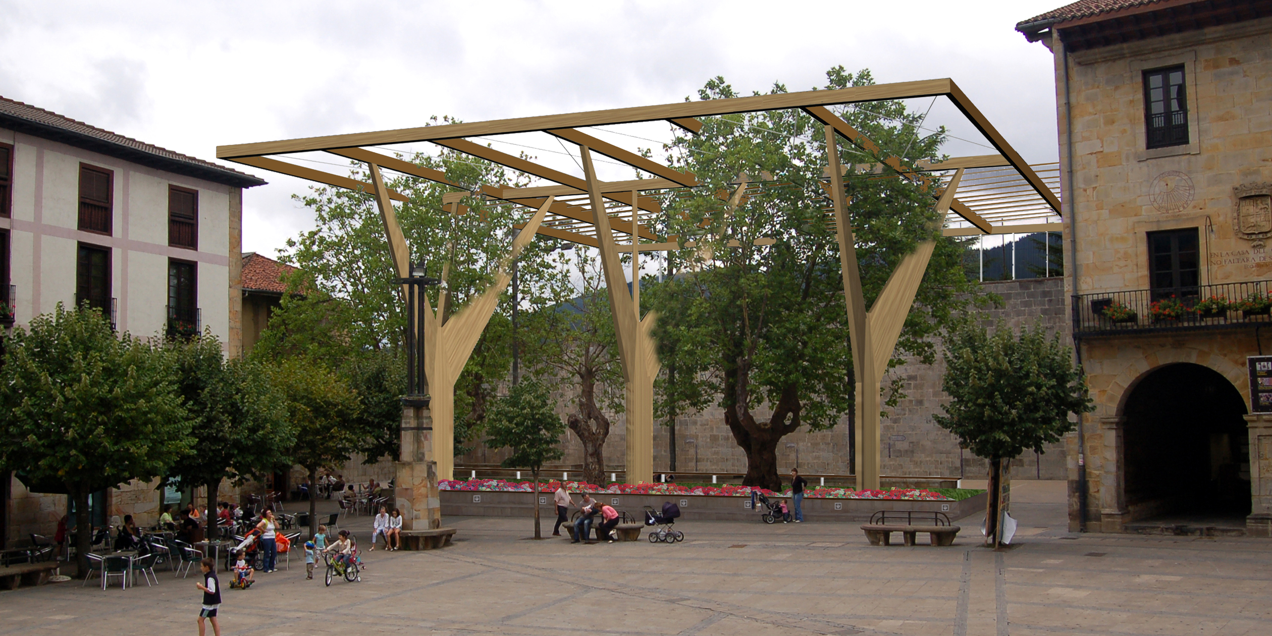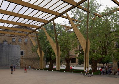 Se propone la eliminación del graderío que separa el frontón de la plaza, dejando únicamente el primer escalón, que establece el límite de actuación de la propuesta en lo que se refiere al tratamiento de superficie. Dicho límite contendrá un parterre con césped y plantas ornamentales de vivos colores.