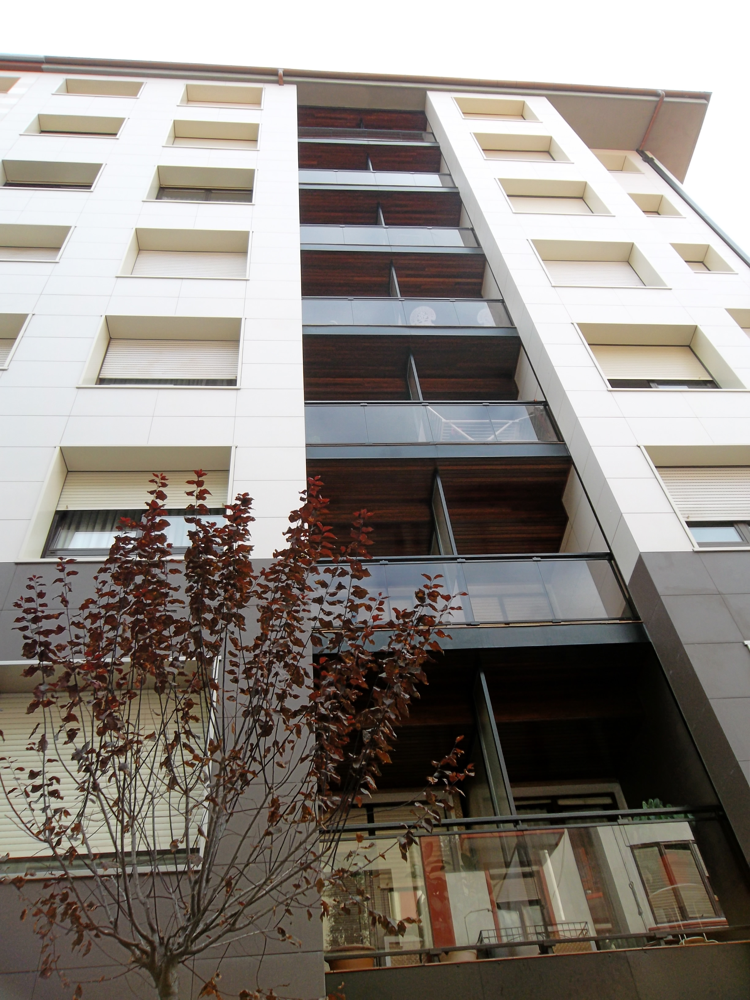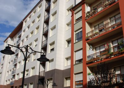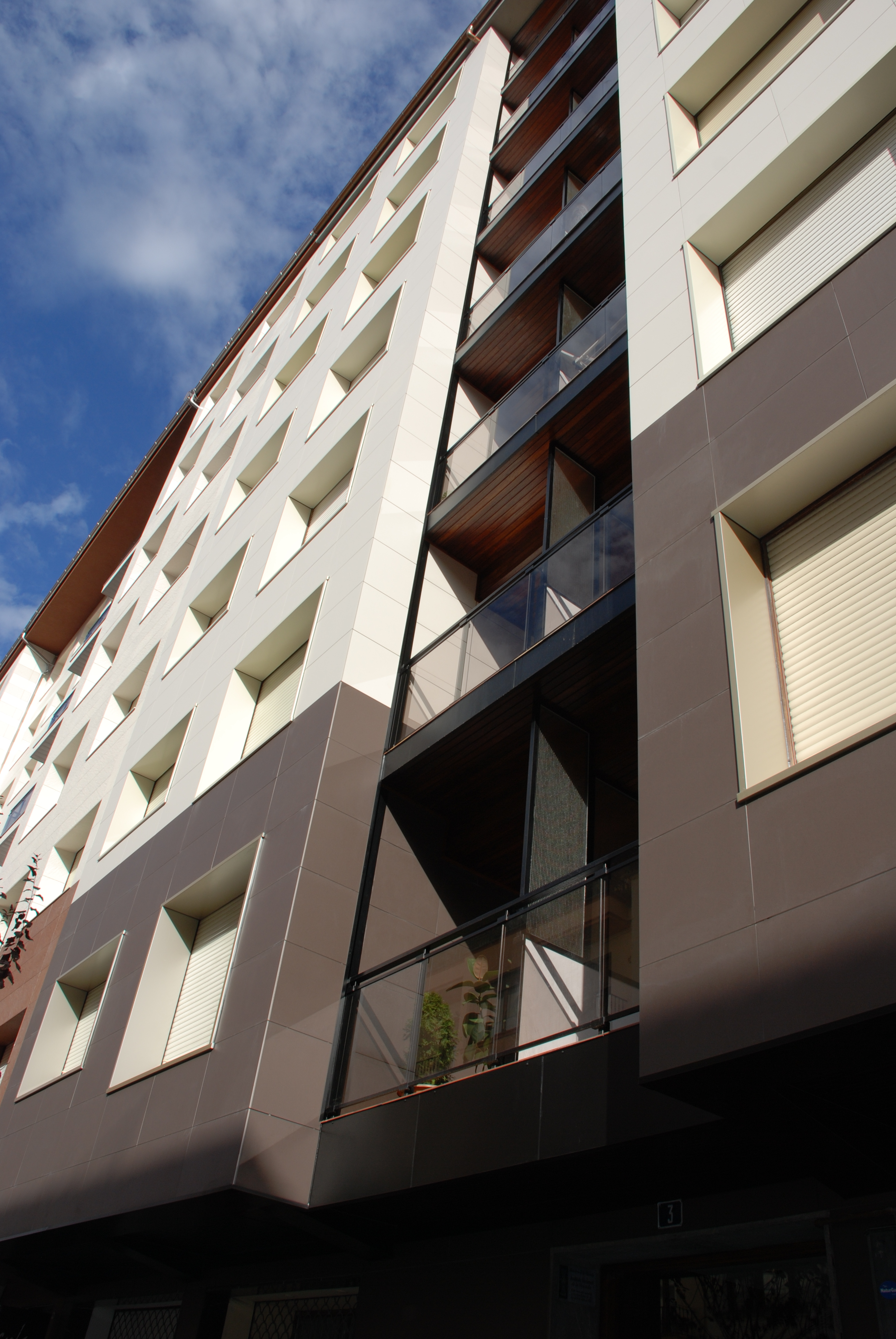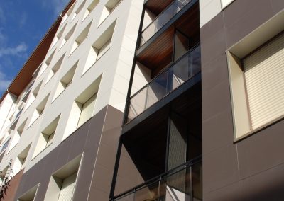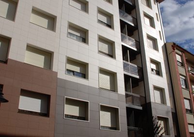 El proyecto consistía en la rehabilitación de una fachada de un bloque de viviendas de los años 60 que no disponía de ningún tipo de aislamiento térmico. Con objeto de mejorar las prestaciones térmicas y de impermeabilidad se optó por una fachada de tipo transventilado, con acabado en cerámica. La estanqueidad de los huecos de ventana se reforzó mediante recercos de material composite que evitó tener que picar todas las mochetas y vierteaguas. A nivel compositivo se trató en un color, a modo de zócalo hasta la primera planta y un color distinto para el resto de las plantas